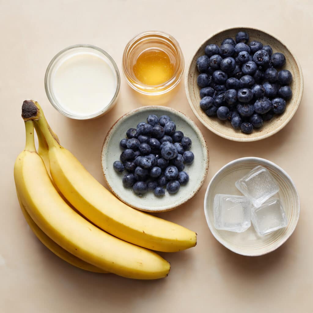 - Combine Ingredients: Add the milk, bananas, blueberries, honey, and ice cubes into the blender.