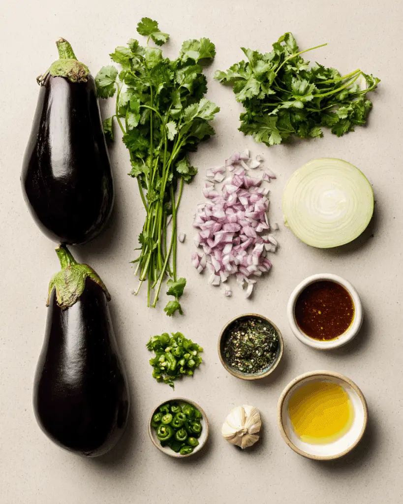 - Eggplant (Brinjal): 2 large – roasted until charred and soft, forms the smoky, creamy base.