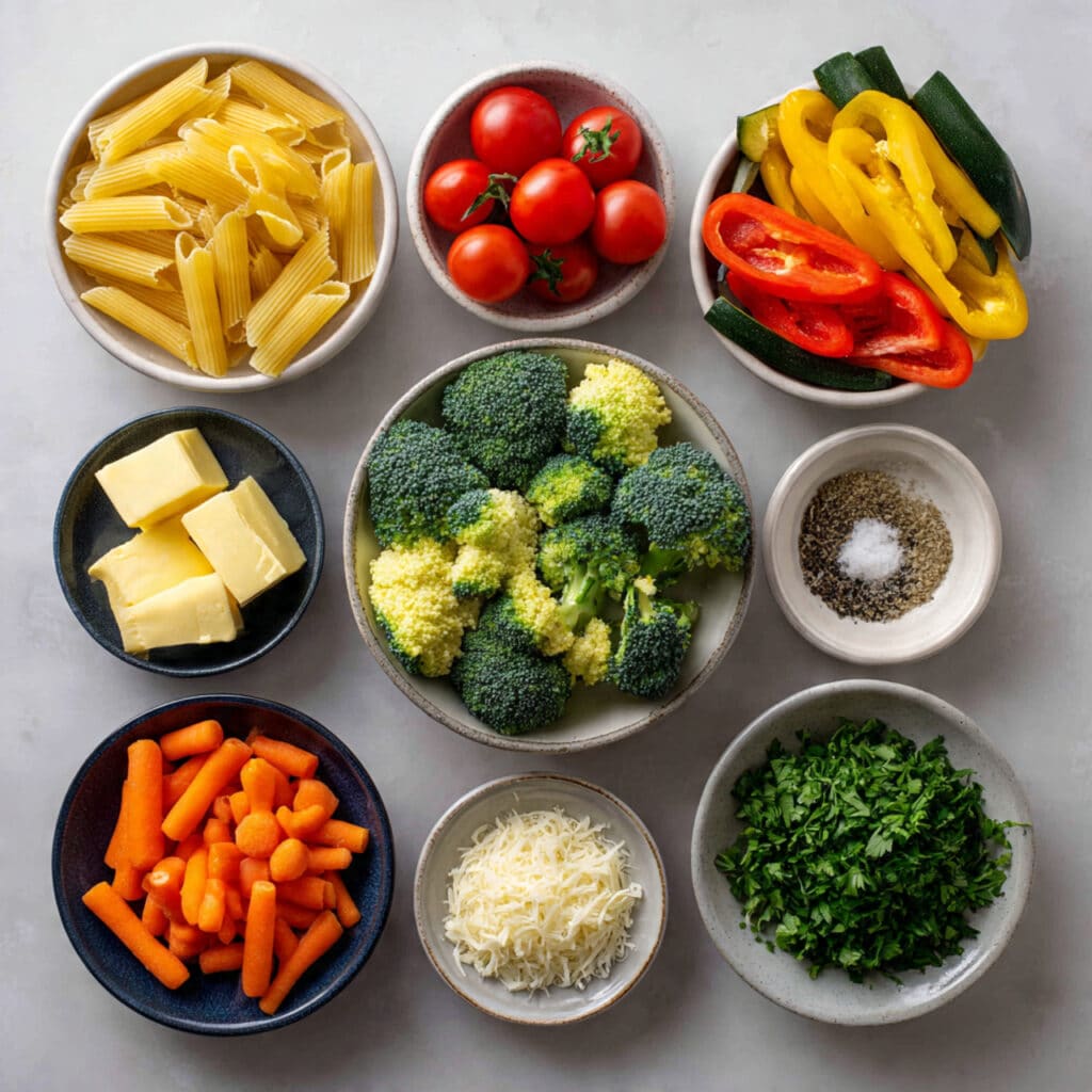 Ingredients in Vegetable Pasta Primavera with Garlic Butter